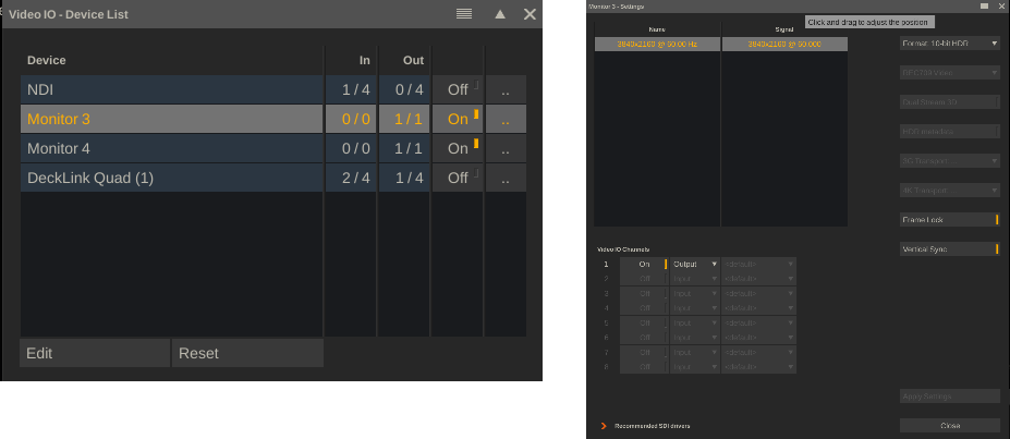 The case of a single display output, whether a single physical output or a virtual one with an Nvidia mosaic, only requires vsync. This should be enabled in the Player – Settings – General menu, as well as in the VideoIO settings for the display device (for the Dual Head, this is automatically enabled). In an LED volume the camera and the LED processor would be genlocked and the LED processor provides the vsync for the GPU output. The refresh rate of the display should preferably be the same or a multiple of the media playback framerate, to prevent stuttering.