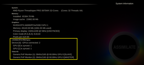 The status of each display in relation to the RTX Pro Sync setup is displayed on the info-overlay on the startup screen (click once in the upper part of the startup screen to open the overlay). The status is also written to the standard log file. It is important to check if all display outputs used (except main UI) have the proper Sync state – either as Slave or Master.