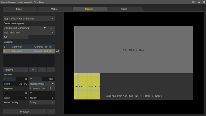 In a lot of cases the resolution of an LED wall differs from the standard display output to an LED processor, and a mapping is needed to define how the pixels for the LED wall(s) are output over one or more display outputs. This is done in the Mapper tab of the Stage Manager. In a mapping you define which (portion of a) wall is to be output to which (portion of a) display output.